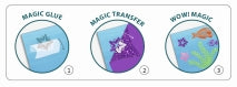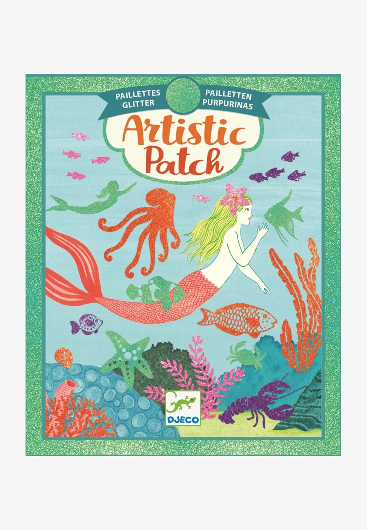 Druk de afbeeldingen op de gewenste plaats van de prent. Verwijder voorzichtig de bovenste laag zodat er een kleeflaag vrij komt. Deze kan je dan met de gewenste blaadjes kleefglitters opvullen. Zo creëer je op een eenvoudige wijze glitterfiguurtjes. Het deksel van de verpakking geeft een beeld van het resultaat. Zeer mooie "Artistic Patch" reeks met verschillende technieken. Probeer ze allemaal eens! Van 6-10j.