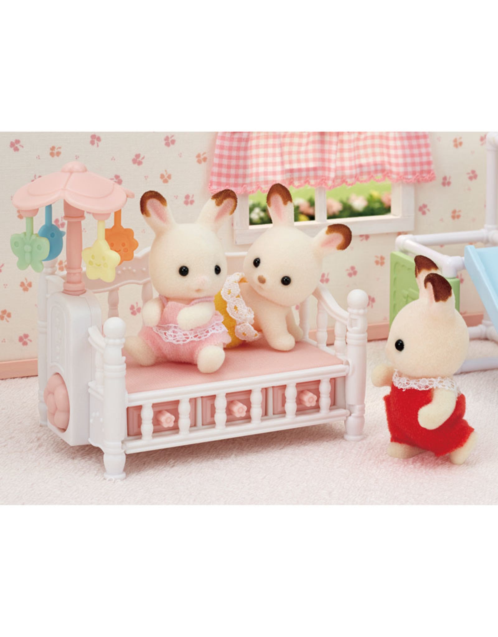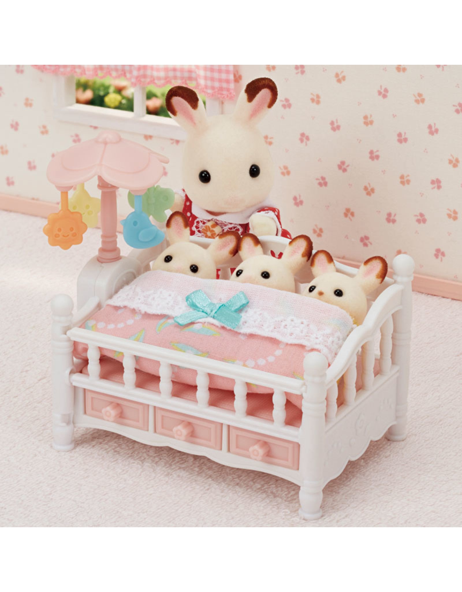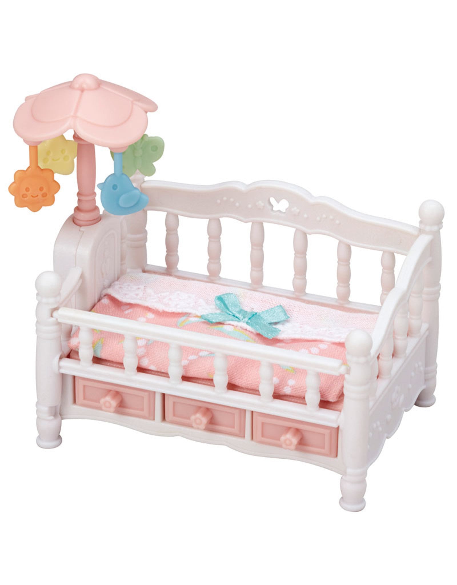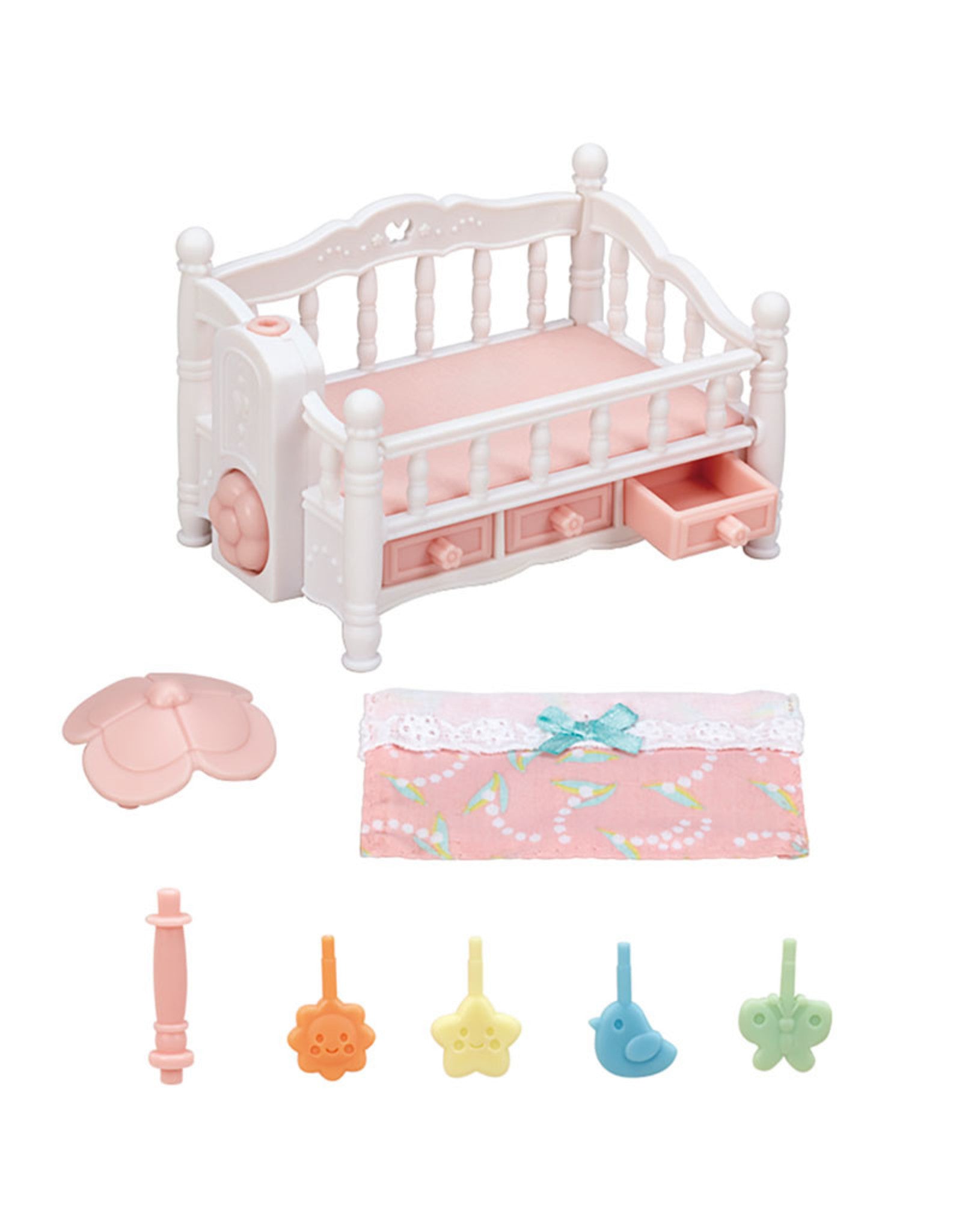 Een lief bedje met een mobiel erboven voor een complete Sylvanian Families drieling. De baby's kunnen fijn kijken naar het mobieltje. Het bedje kan ook als box worden gebruikt.