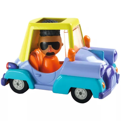 Deze funky bolide is een zomerse speelgoedauto in de kleuren paars, blauw, geel en oranje. De bestuurder met zonnebril zit vast in zijn Funky Bolide en kan er niet worden uitgehaald.