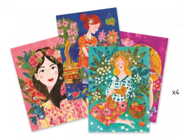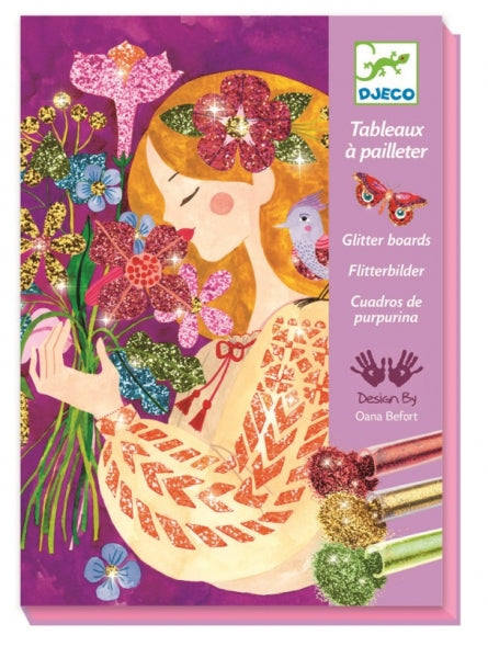 Breng de bloemen tot leven door ze te laten schitteren. Je brengt de glitterpoeder makkelijk aan op de achtergronden met plakstrips. Overtollige glitters kan je hergebruiken. Vanaf 7j.