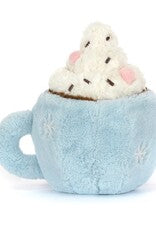 Een beker met warme chocolademelk, een dikke toef slagroom met gesmolten marshmallows en chocolade hagelslag erop, daar wordt toch iedereen vrolijk van ? De snoezige bruine laarsjes en de opgewekte glimlach maken het helemaal af.