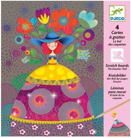 Een leuke set kraskaarten van het Franse kwaliteitsmerk Djeco. Je krast voorzichtig de donkergrijze laag weg en er verschijnt een mooie kleurige en feestelijke afbeelding, die je daarna kunt ophangen.