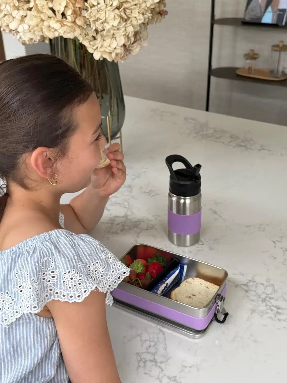 Deze ruime lunchbox biedt genoeg plek voor je favoriete broodjes, snacks of salade. Dankzij de superhandige verdeler blijft alles goed gescheiden opgeborgen zitten. Er zit een siliconen band om de box, die zorgt voor extra grip én een stijlvolle look.