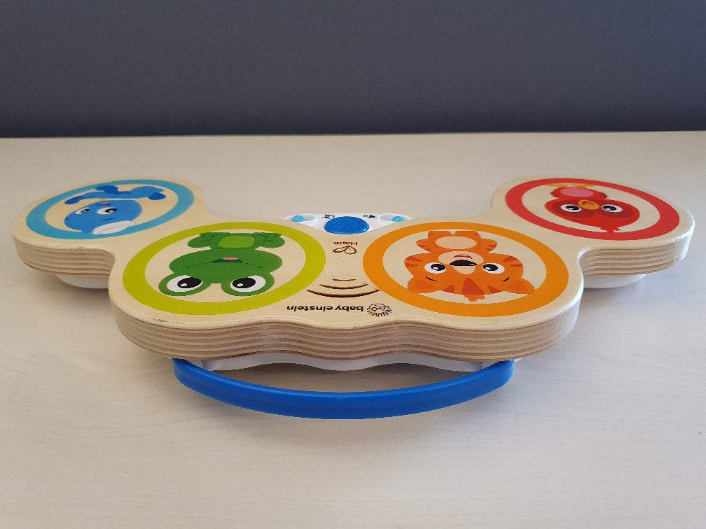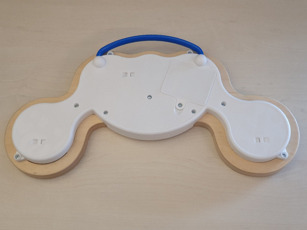 Als je op de blauwe knop drukt, hoor je een melodie. Als je de rechterknop naar rechts schuift, kan je tijdens een melodie mee drummen. Er zijn 6 verschillende melodietjes! Vindt je het drumgeluid er niet bij passen, dan kan je het drumgeluid veranderen. Zoek je het melodietje op wat je mooi vindt en maak je je eigen creatie!