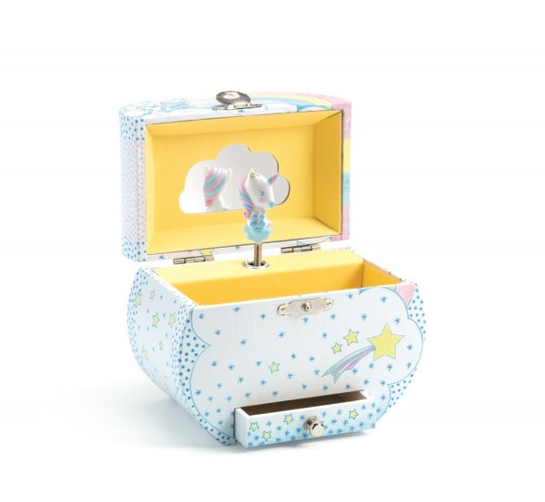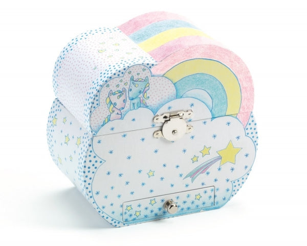 Een wolk van een muziek- en opbergdoosje. Draai aan het sleuteltje aan de achterkant, open het deksel en een lieftallige eenhoorn draait rond op de muziek "De Mooie Blauwe Donau" van Johan Strauss. Onderaan een extra schuifje.