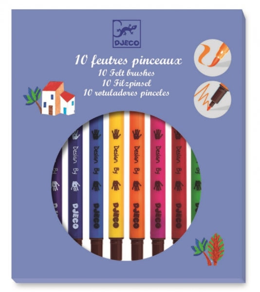 Doosje met 10 penseelstiften (tweezijdige stiften, met aan de ene zijde een gewone viltstift en aan de andere een flexibele penseeltip). Klassieke kleuren. Je wilt nooit meer andere! Vanaf 6 jaar.