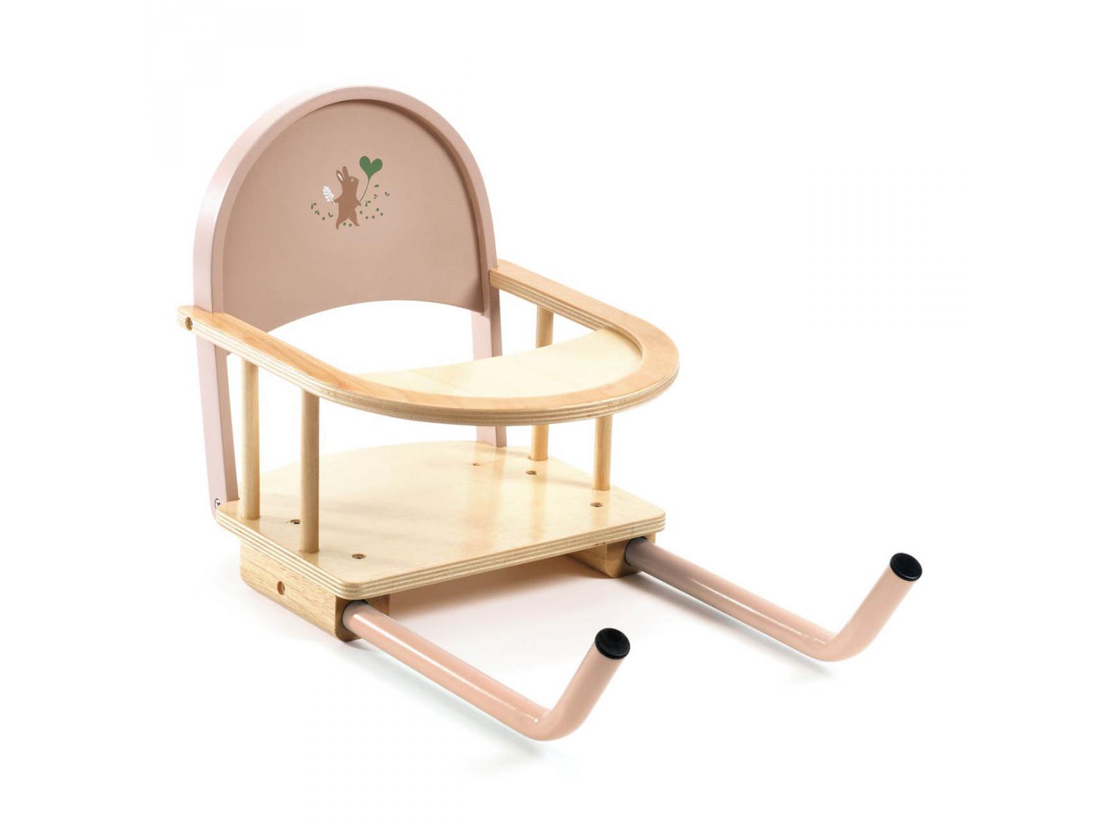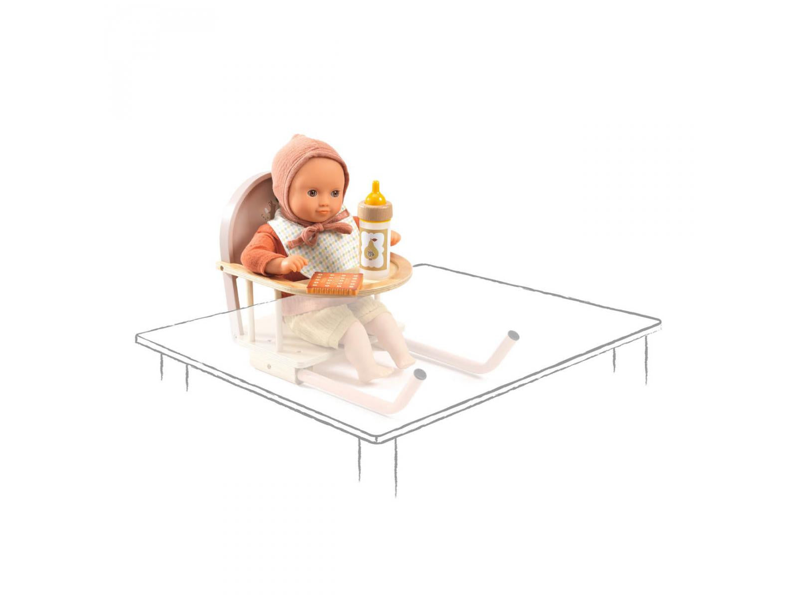 Poppen voelen zich helemaal op hun gemak in deze houten poppenstoel 'Baby Chair'van het Franse topmerk Djeco. De stoel heeft een ingebouwd tafelblad, waarop het eten en het bestek gezet kunnen worden en dat zorgt dat de pop goed blijft zitten !