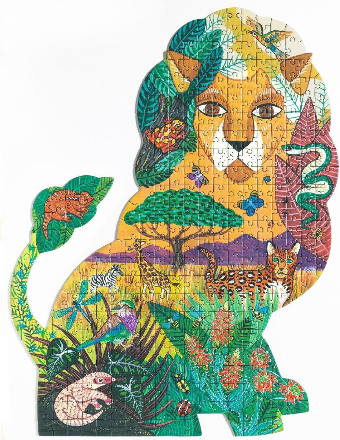 De Puzz’Art Leeuw van het Franse topmerk Djeco is een ongewone puzzel. Hij is niet vierkant, hij is niet rond, hij heeft het silhouet van de leeuw, die hij uitbeeldt. Hij bestaat uit wel 350 stukjes, dus daar ben je wel even mee bezig !