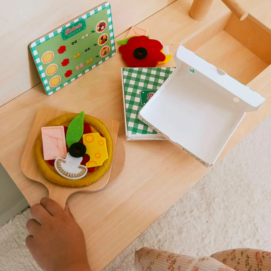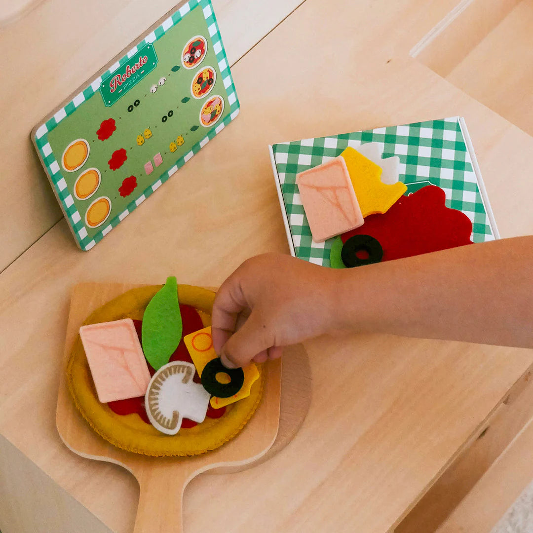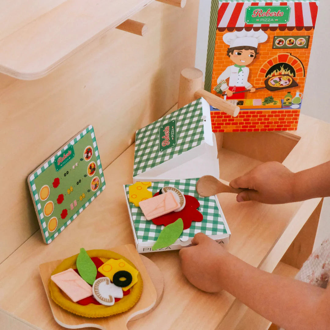 Deze fantasievolle set van het Franse topmerk Djeco bevat 1 houten pizzaschep, 2 pizzabodems van suède stof, 2 vilten tomatensaus, 10 vilten andere ingrediënten, 1 houten pizzaoven en 2 pizzadozen.