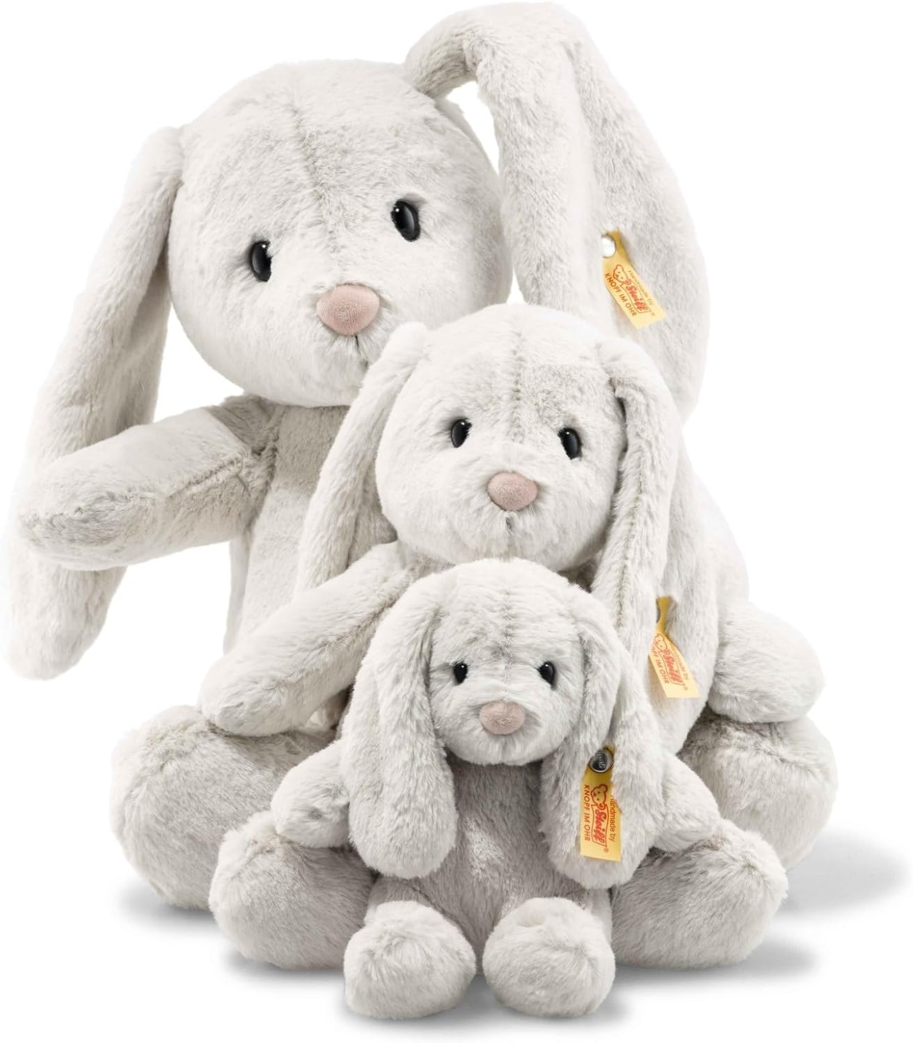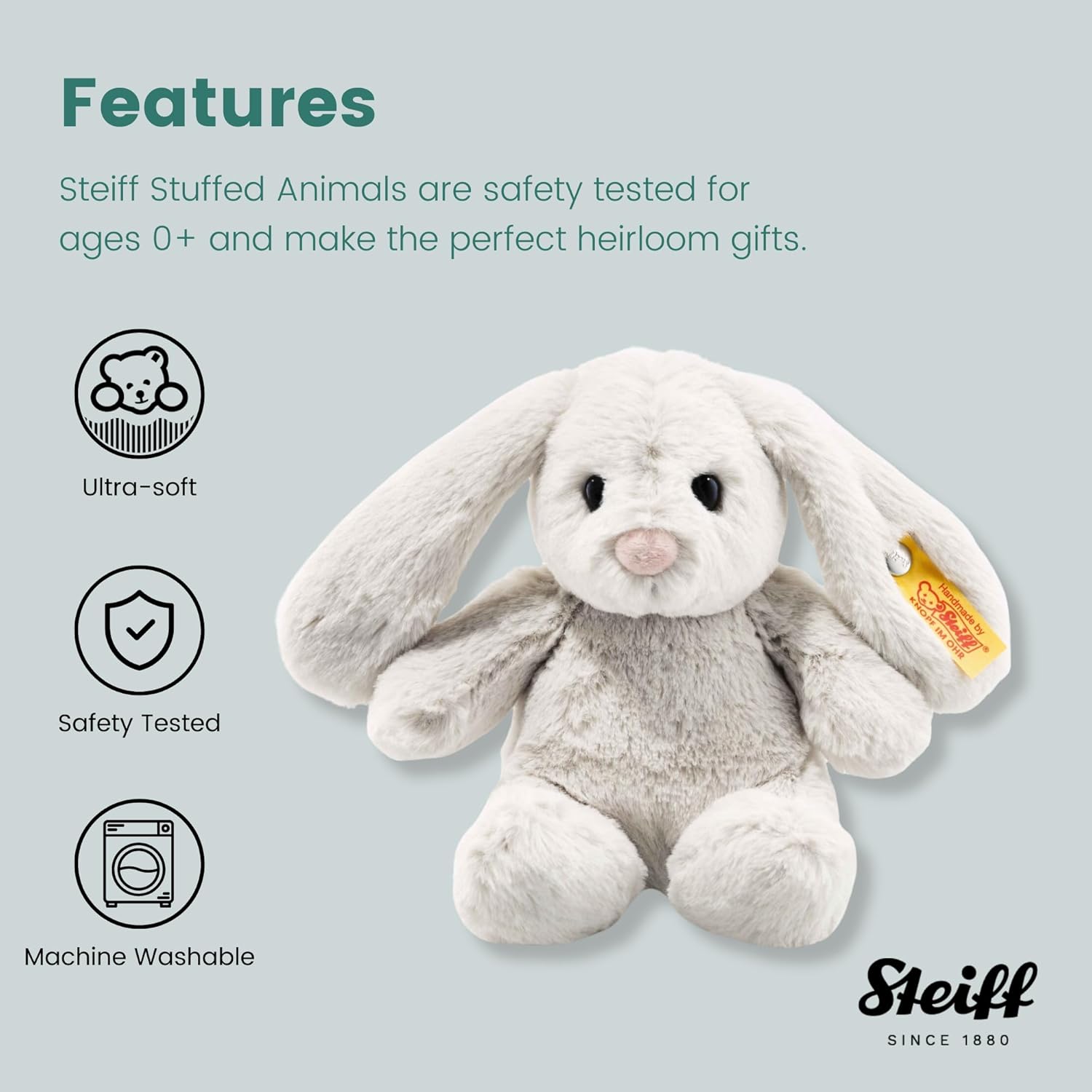 Gelukkig maakt Steiff nog veel meer andere knuffels, zoals dit schattige haasje. Hij heet Hoppie en voelt heerlijk zacht aan. Hoppie is gemaakt van zacht geweven pluche in heel lichtgrijs. Hij heeft een vriendelijk gezicht, een zachte pluchen roze neus en zwarte veiligheidsogen. Aan zijn linkeroor zit het bekende knop-in-oorlabel, waarmee aangetoond wordt dat hij een authentieke Steiff-knuffel is.