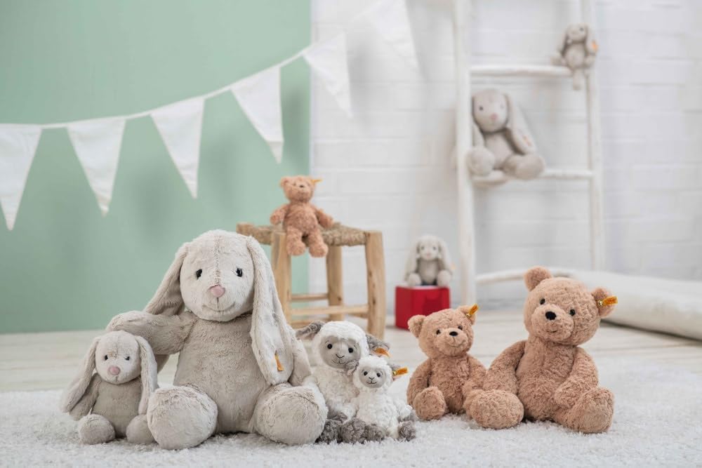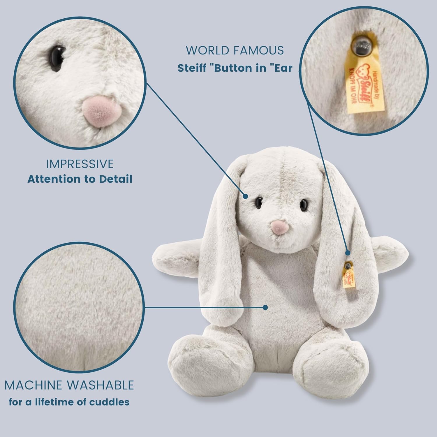 Gelukkig maakt Steiff nog veel meer andere knuffels, zoals dit schattige haasje. Hij heet Hoppie en voelt heerlijk zacht aan. Hoppie is gemaakt van zacht geweven pluche in heel lichtgrijs. Hij heeft een vriendelijk gezicht, een zachte pluchen roze neus en zwarte veiligheidsogen. Aan zijn linkeroor zit het bekende knop-in-oorlabel, waarmee aangetoond wordt dat hij een authentieke Steiff-knuffel is.